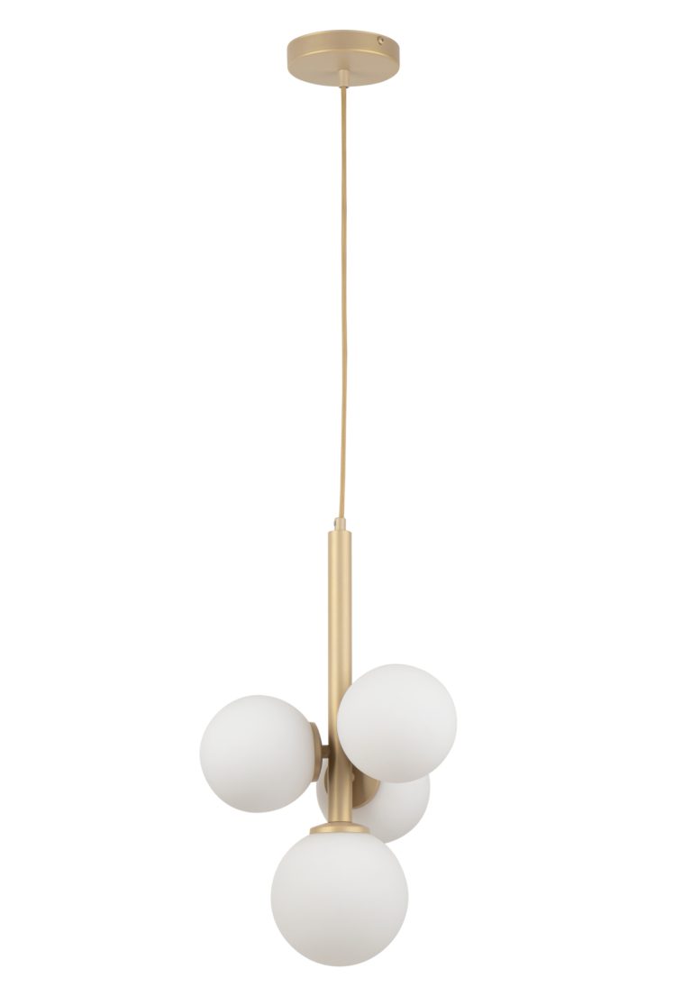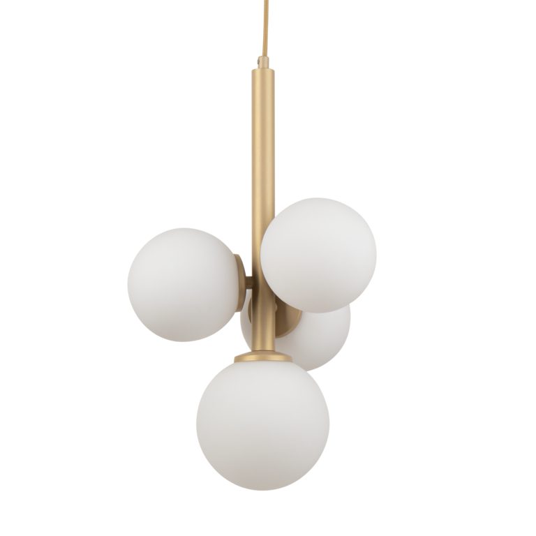 Wśród aktualnie panujących trendów znajduje się, między innymi, moda na lampy geometryczne, wykorzystujące proste formy. Oferowane przez nasz sklep oświetlenie Sunneva 4 wyposażone jest w prosty pionowy stelaż w kolorze beżowym (z drobinkami złota) oraz cztery klosze w kształcie kul. To właśnie ta ponadczasowa forma w połączeniu z eleganckim zestawem barw sprawia, że lampa wisząca Sunneva 4 z mlecznobiałymi kloszami emanuje ponadczasową elegancją i tak dobrze wpisuje się we współczesne trendy.