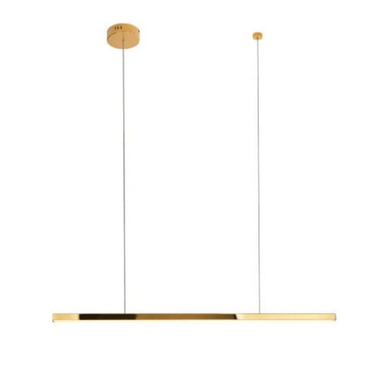 Sufitowa lampa LED składa się ze smukłej podłużnej listwy zawieszonej na dwóch pionowych uchwytach. Połączenie prostej kompozycji z połyskującą barwą złota jest tutaj bardzo efektowne, prawda? Lampa jest szeroka na 100 cm, zaś sama listwa jest gruba na zaledwie 2,5 cm. Nowoczesne oświetlenie LED posiada regulację wysokości, zatem złoty żyrandol powiesić możesz nawet 150 cm od sufitu. Zwróć uwagę na asymetryczny charakter okrągłych podsufitek oraz na przyciągającą wzrok obudowę listwy. Wszystko tworzy bardzo harmonijną i spójną całość. Zapoznaj się z dokładnymi wymiarami oświetlenia sufitowego z załączonego szkicu technicznego, by jeszcze lepiej dopasować lampę do swojego wnętrza.