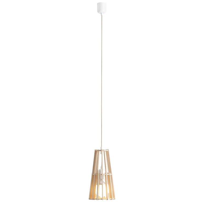 Jak dokładnie prezentuje się oferowana lampa wisząca z drewna? Cała oprawa ma postać pojedynczego zwisu, na który składa się niewielka podsufitka, przewód zasilający, oprawka na jedno źródło światła oraz ozdobny ażurowy klosz. Abażur wykonany został z drewnianych listw, które tworzą stożkową bryłę, doskonale przepuszczającą światło. Lampa wisząca do kuchni i jadalni Ferb S to zarówno funkcjonalne oświetlenie, jak i dodatek, który wniesie do wnętrza przyjazną, ciepłą atmosferę.