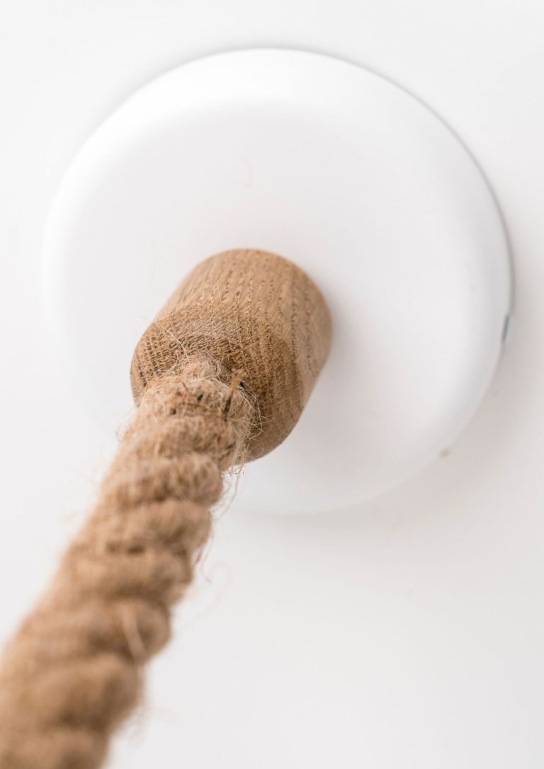 Niezwykły charakter tej minimalistycznej lampie wiszącej nadaje przede wszystkim gruba konopna lina, na której umieszczono długi drewniany gwint, a także – dobrana już przez Ciebie indywidualnie – duża żarówka. Industrialny zwis przymocowany jest do sufitu za pomocą białej podsufitki o średnicy 12 cm. Cała lampa ma długość 1 metra. Jak niewiele trzeba, by stworzyć nowoczesne, proste oraz nieszablonowe oświetlenie, prawda?