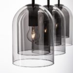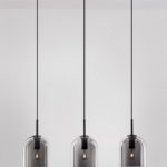 Oferowana propozycja ma postać lampy wiszącej na listwie, wyposażonej w trzy źródła światła. Każde z nich znajduje się w osobnym, podwójnym kloszu, wykonanym ze szkła w przydymionym odcieniu. Sam stelaż jest metalowy i wraz z zawieszeniem oraz oprawkami wyróżnia się zdecydowanym czarnym kolorem, który idealnie komponuje się z kloszami. Kolorystyka ta fantastycznie zgrywa się z aranżacjami nowoczesnymi, loftowymi oraz industrialnymi, w których często wykorzystuje się szklane i metalowe lampy w ciemnym kolorze.