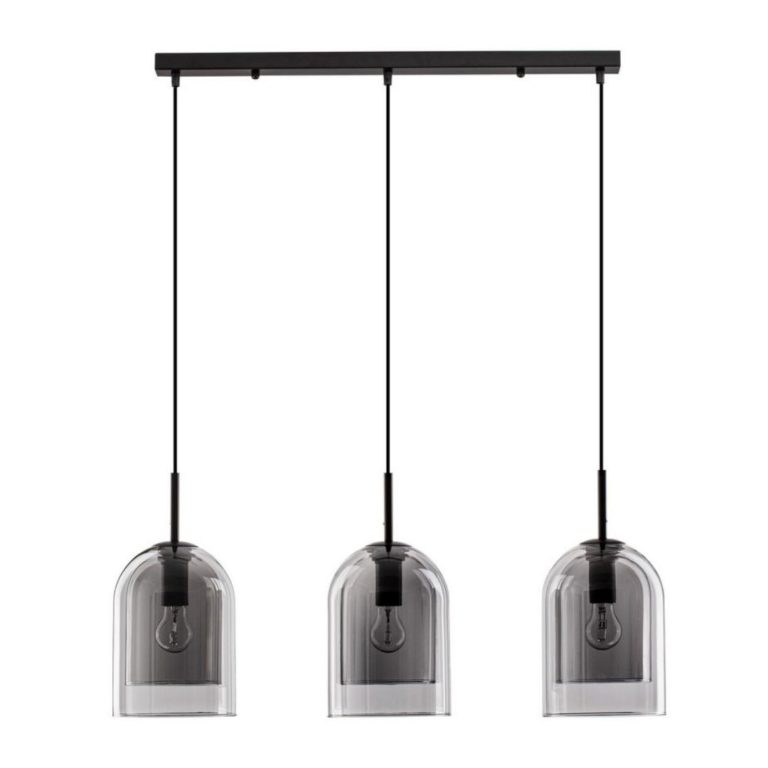 Oferowana propozycja ma postać lampy wiszącej na listwie, wyposażonej w trzy źródła światła. Każde z nich znajduje się w osobnym, podwójnym kloszu, wykonanym ze szkła w przydymionym odcieniu. Sam stelaż jest metalowy i wraz z zawieszeniem oraz oprawkami wyróżnia się zdecydowanym czarnym kolorem, który idealnie komponuje się z kloszami. Kolorystyka ta fantastycznie zgrywa się z aranżacjami nowoczesnymi, loftowymi oraz industrialnymi, w których często wykorzystuje się szklane i metalowe lampy w ciemnym kolorze.