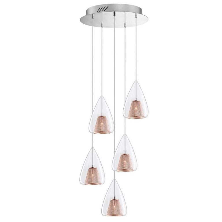 Lampa wisząca w nowoczesnym stylu Yumbo 5 Ring to zarówno elegancka forma, jak i projekt przemyślany pod kątem praktycznego użytkowania. Dostępne w naszym sklepie oświetlenie wewnętrzne Yumbo 5 Ring składa się z okrągłej podsufitki oraz pięciu zwisów z przezroczystymi kloszami. Dodatkowo każdy z nich wyposażony jest w metalową drucianą osłonę w kolorze miedzi, która znajduje się bezpośrednio przy źródłach światła.