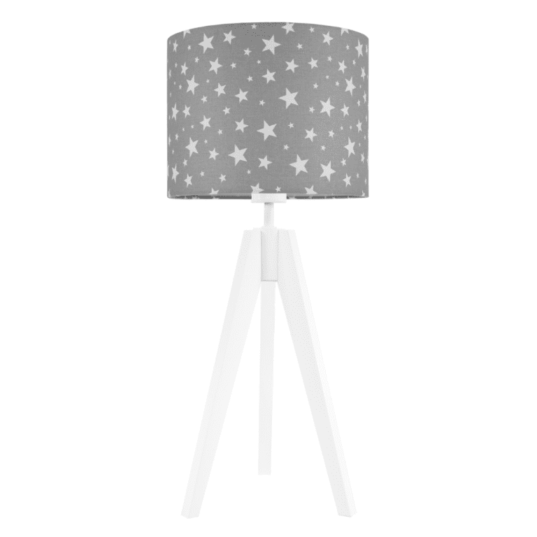 Dziecięca lampka stołowa z abażurem w gwiazdki dostępna w naszej ofercie swoją unikalność zyskała dzięki stelażowi w kształcie trójnogu. Swoim wyglądem przypomina on statyw aparatu fotograficznego, dzięki czemu jest nietuzinkowy.