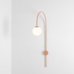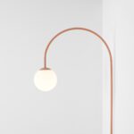 Una składa się z wygiętego metalowego stelaża w kolorze koralowym zakończonego szklanym mlecznobiałym kloszem o formie idealnej kuli. Oba elementy tworzą spójną estetycznie całość, w której geometria spotyka się z subtelnością. Łukowy kinkiet ścienny Una z kulistym kloszem i metalowym stelażem doskonale nadaje się do aranżacji nowoczesnych i minimalistycznych, ale także inspirowanych stylem modern classic, skandynawskim oraz soft glam.