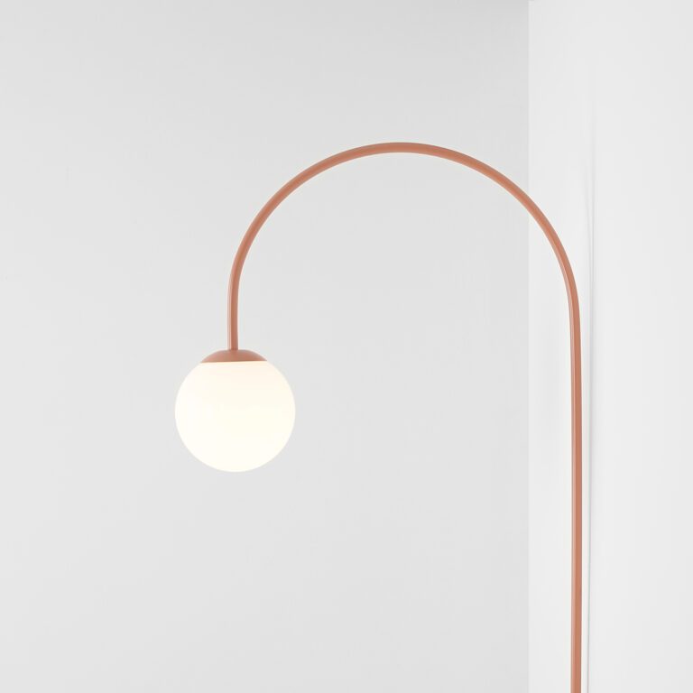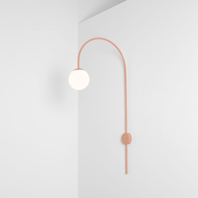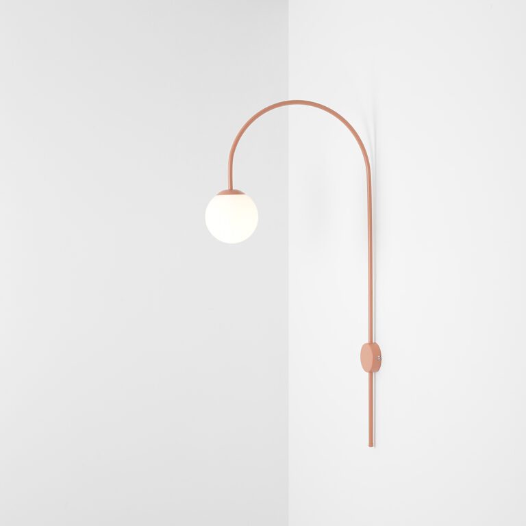 Una składa się z wygiętego metalowego stelaża w kolorze koralowym zakończonego szklanym mlecznobiałym kloszem o formie idealnej kuli. Oba elementy tworzą spójną estetycznie całość, w której geometria spotyka się z subtelnością. Łukowy kinkiet ścienny Una z kulistym kloszem i metalowym stelażem doskonale nadaje się do aranżacji nowoczesnych i minimalistycznych, ale także inspirowanych stylem modern classic, skandynawskim oraz soft glam.