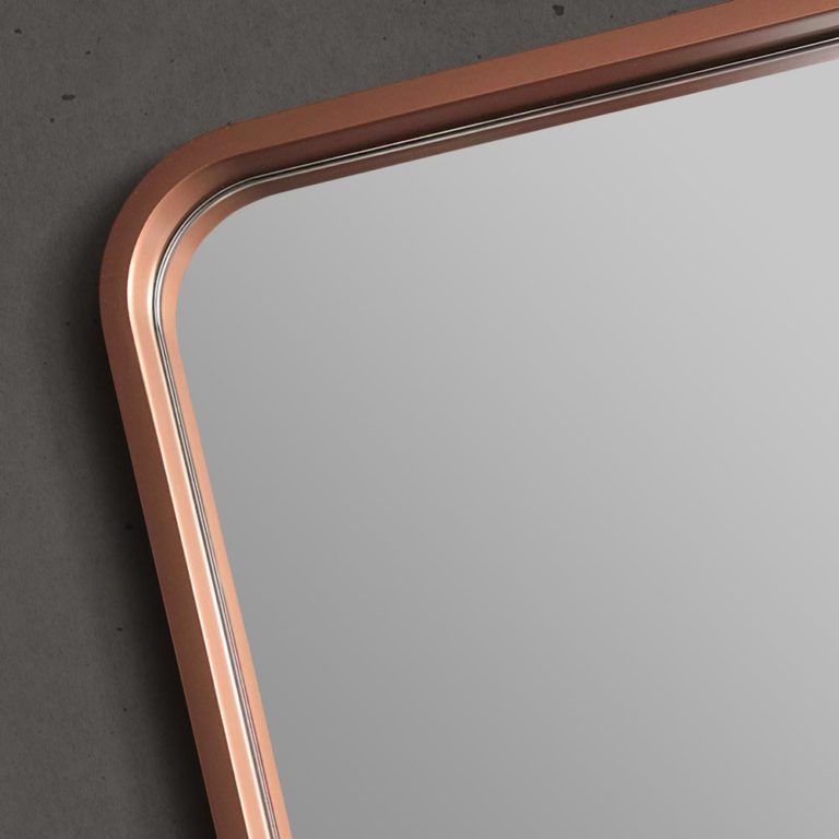 Najbardziej dekoracyjnym elementem lustra łazienkowego Billet jest zdecydowanie jego miedziana rama o matowym wykończeniu. Obramowanie ma szerokość 10 cm i grubość 38 cm, co nadaje całości minimalistycznej elegancji. Prostokątne lustro z miedzianą ramą Billet idealnie komponuje się z dodatkami w tym samym odcieniu (na przykład z miedzianą baterią umywalkową, ramkami na zdjęcia w kolorze rose gold), ale także z wieloma innymi barwami – i tak miedziane lustro świetnie współgra, chociażby z bielą, czernią i szarością.