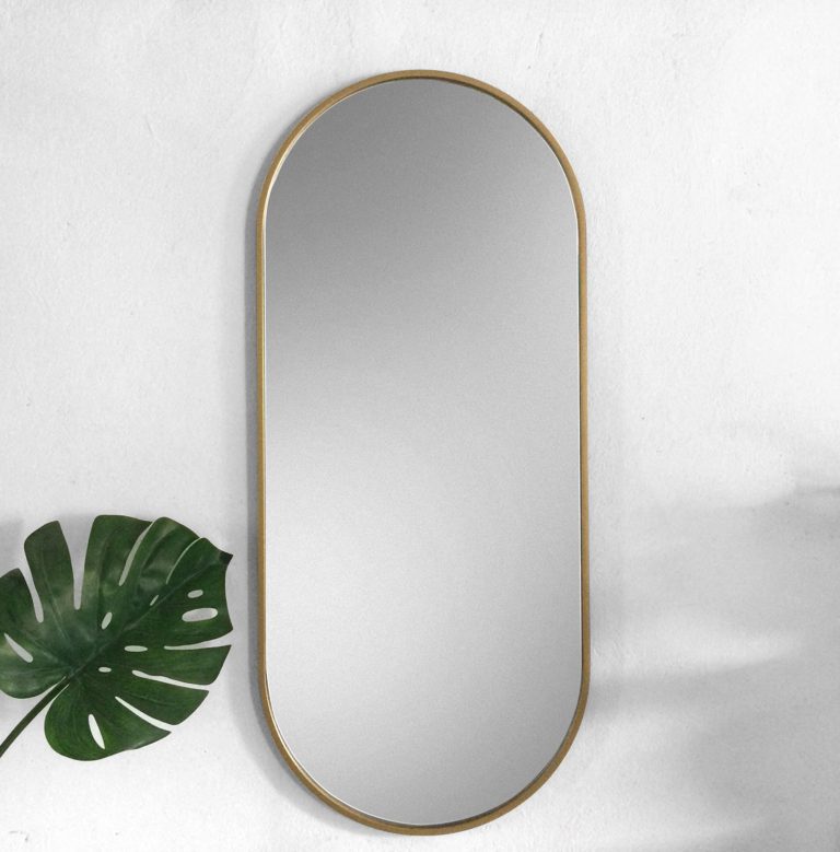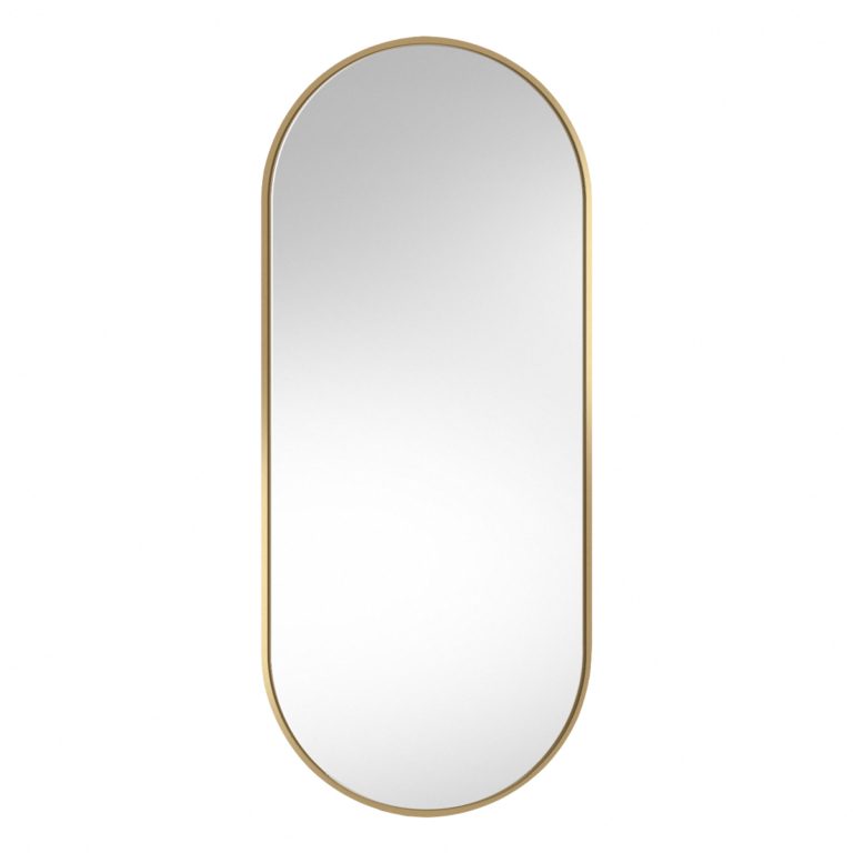 Polecane przez sklep online Ryssa lustro w nowoczesnym stylu ze złotą ramą Ambient Slim przeznaczone jest do zamontowania na ścianie – model wyposażono w dwa praktyczne wieszaki, które znajdują się w jego tylnej części. Oferowane zwierciadło na ścianę ma stylowy owalny kształt i występuje w różnych rozmiarach do wyboru, co zdecydowanie ułatwi Ci dopasowanie go do wybranego wnętrza!