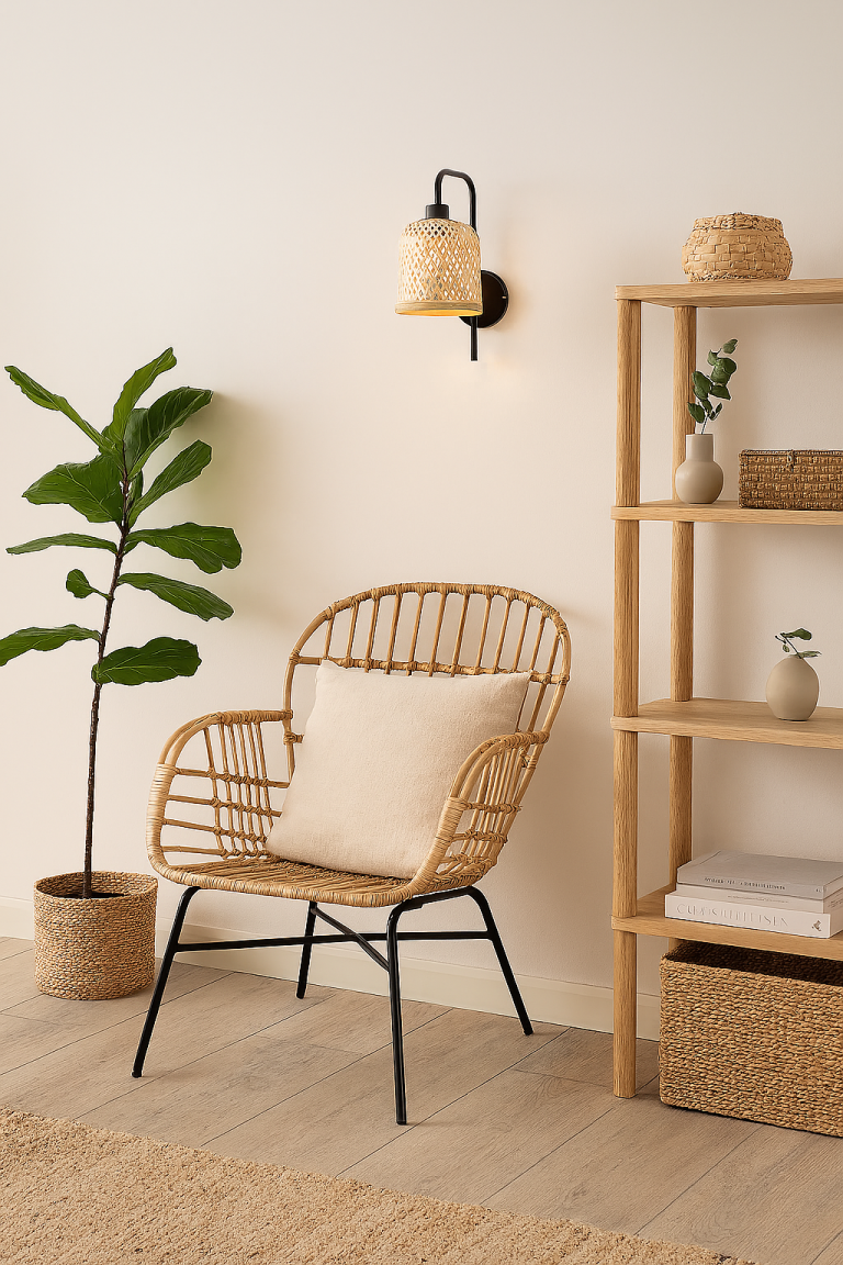 Metalowa lampa ścienna Talitas z rattanowym kloszem