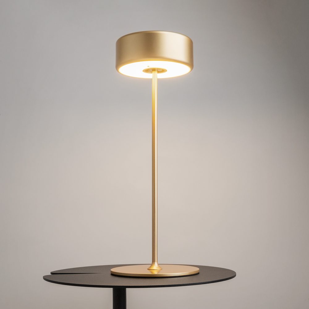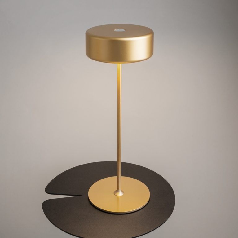 Pełna elegancji, metalowa lampa stołowa Al Collaboration w złotym kolorze wyposażona jest w oświetlenie LED – światło możesz ściemniać, a także dostosować jego barwę w zakresie od 2200 do 4000 K. Oferowana lampa LED posiada również dotykowy włącznik i ładowana jest kablem USB.
