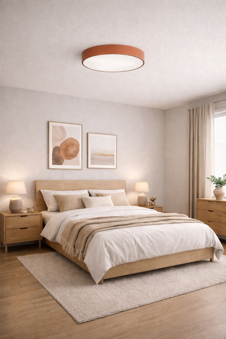 Plafon do sypialni i salonu Newa doskonale pasuje do bardzo różnych od siebie aranżacji. Można go z powodzeniem wykorzystać jako element wystroju w stylu nowoczesnym, ale także klasycznym czy glamour. Miedziany kolor oprawy przepięknie współgra z innymi dodatkami w tym samym kolorze, ale również z bielą, czernią, granatem i butelkową zielenią. Dodatkowo miedź ociepla wizualnie pomieszczenie, dzięki czemu przebywanie w nim staje się jeszcze przyjemniejsze!