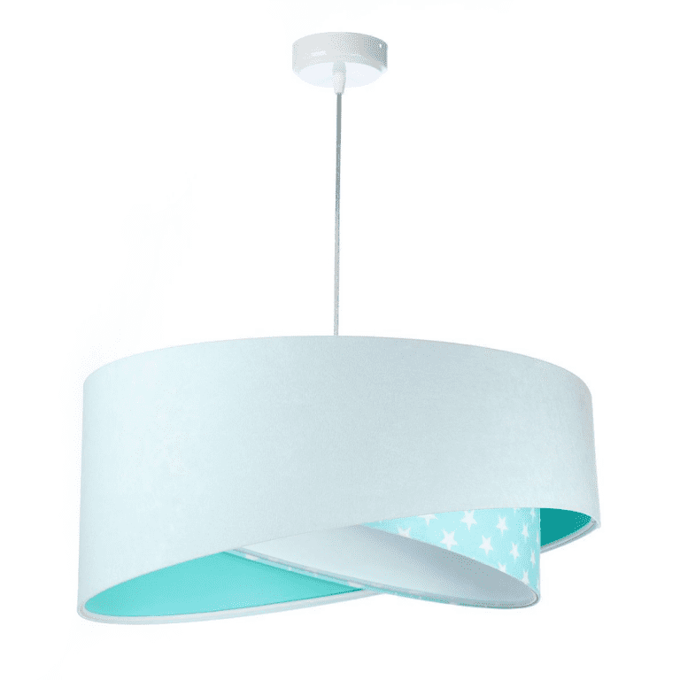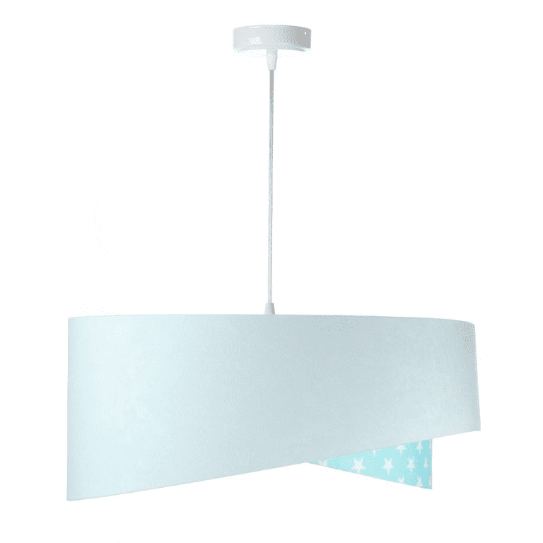 Miętowa lampa składa się z podwójnego klosza o asymetrycznym kształcie, który pokryty jest welurową tkaniną. Średnica abażura wynosi 50 cm, zaś jego wysokość równa jest 23 cm. Aksamitna faktura materiału świetnie współgra z odbijanym od wnętrza kloszy światłem, a także jest idealna do tego zestawienia kolorystycznego. Czy zwróciłeś uwagę na harmonijną i spójną kompozycję dziecięcej lampy Luna? Wnętrze klosza jest ciemniejsze, klosz mniejszy zdobią białe gwiazdki na miętowym tle, a z zewnątrz nowoczesny żyrandol ma bardzo delikatną i jaśniejszą barwę. Zobaczysz, jak fajnie zmieni się charakter pokoju, gdy oświetlisz go i ozdobisz tą asymetryczną lampą sufitową.