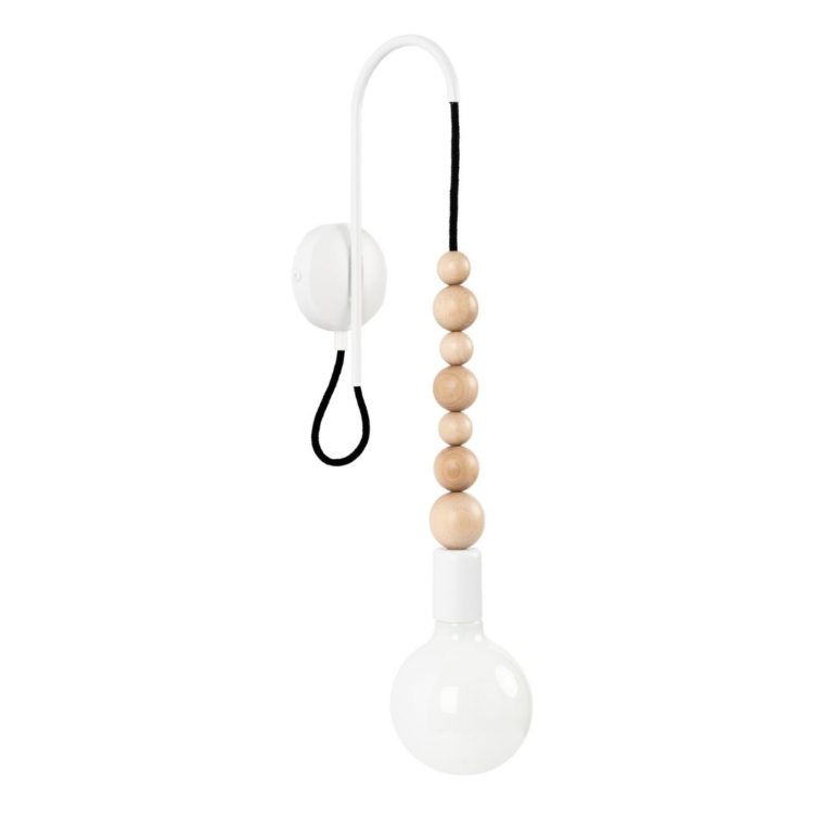 Biały kinkiet Loft Sfarer to połączenie nowoczesności z nutką ekstrawagancji. Stylowo wygięty stelaż trzyma przewód zakończony surowym gwintem do wkręcenia żarówki, który ozdobiony jest ornamentem z drewnianych koralików. Jakże pomysłowy i plastyczny jest pomysł na tę minimalistyczną lampę ścienną, prawa? Połączenie klasycznych kulistych linii, jasnego drewna oraz śnieżnobiałego koloru jest bardzo eleganckie!
