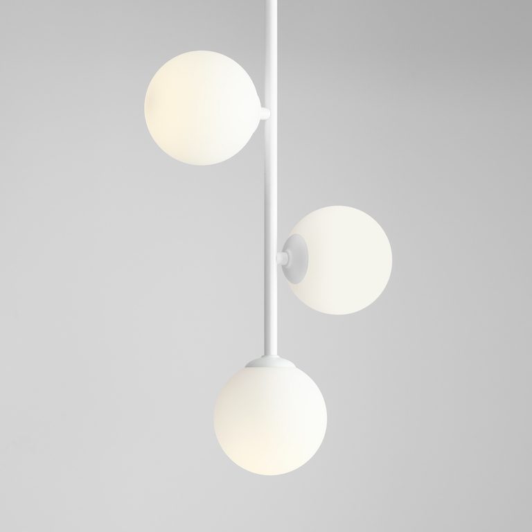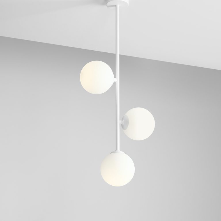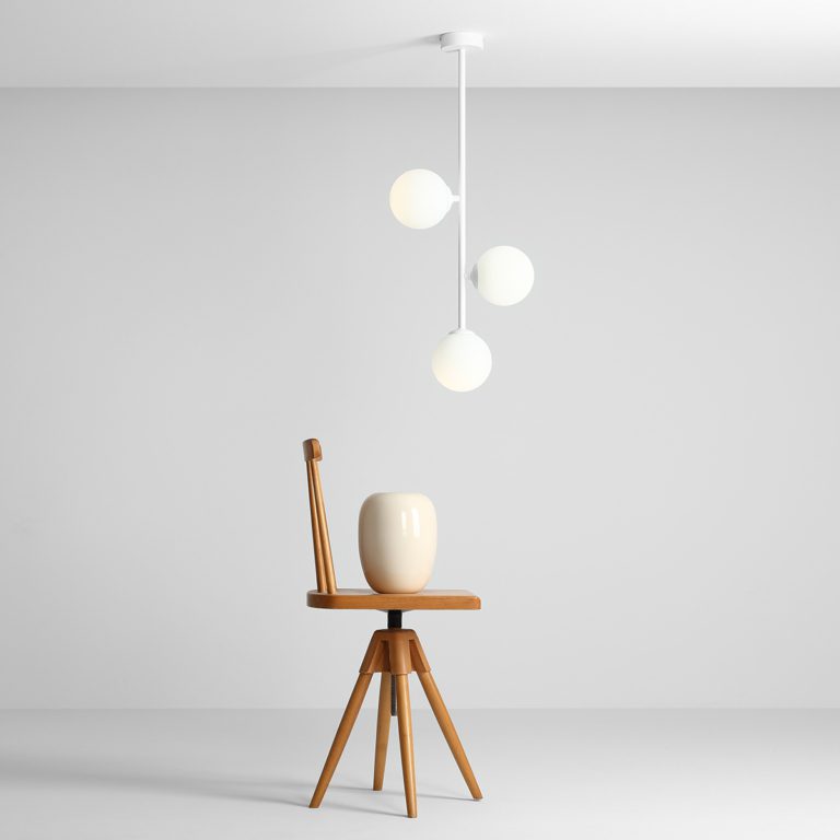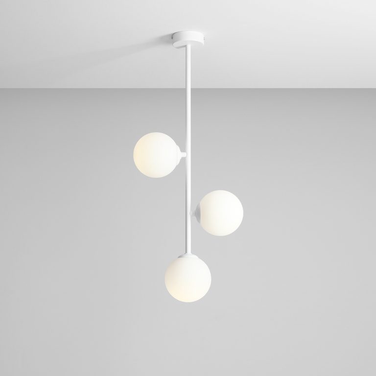 Minimalistyczny biały żyrandol Braga tworzy biały metalowy stelaż, na którym umieszczone są trzy szklane klosze – dwa po bokach i jeden na jego zakończeniu, a całość wieńczy wyrazista podsufitka. Asymetria, która jest harmonią oraz minimalizm o cechach nowoczesności – ta designerska forma naprawdę przyciąga wzrok.