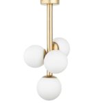 Lampa na sufit Sunneva 4 składa się z metalowego stelaża o prostej formie i złotym kolorze oraz czterech kulistych białych kloszy wykonanych ze szkła. Wygląd minimalistycznej lampy sufitowej Sunneva 4 sprawia, że jest to zarówno modna, jak i ponadczasowa oprawa świetlna.
