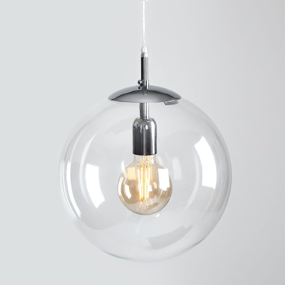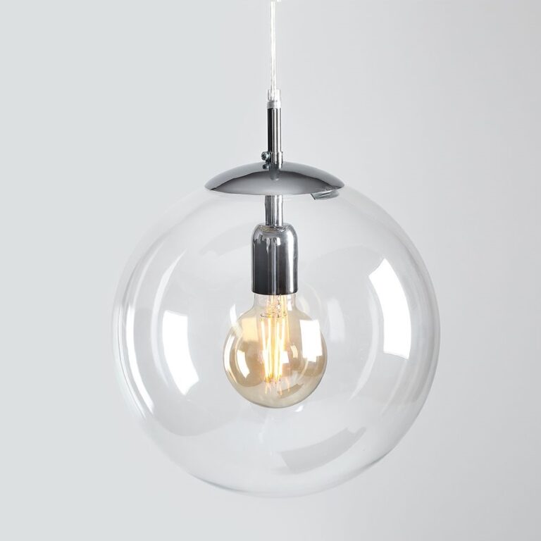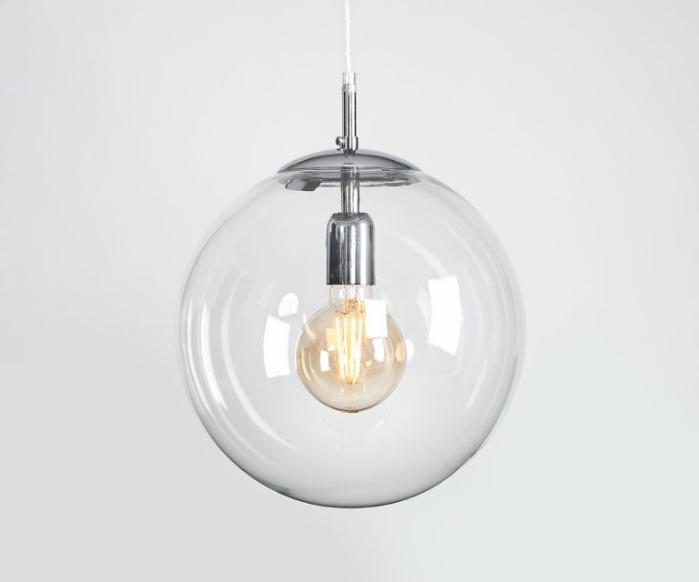 Dostępna w naszym sklepie minimalistyczna lampa wisząca Atma wyposażona jest w metalowy stelaż w kolorze chromu oraz transparentny klosz o średnicy 30 cm. To właśnie połączenie ultra modnych obecnie chromowanych elementów z przezroczystym szkłem sprawia, że całość prezentuje się bardzo nowocześnie. Stelaż subtelnie połyskuje i odbija światło.