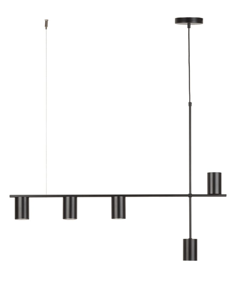 Minimalistyczna lampa wisząca Einar 5 w czarnym kolorze wyjątkowo dobrze pasuje do wnętrz o prostym, a nawet surowym wyglądzie. Możesz wykorzystać ją na przykład jako część wyposażenia aranżacji loftowej lub industrialnej, ale też klasycznie nowoczesnej. Lampa loftowa z pięcioma kloszami z łatwością oświetli wnętrza o różnym metrażu i wysokości. Oferowana oprawa świetlna ma szerokość 90 cm oraz maksymalną wysokość 110 cm.