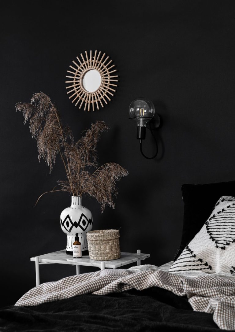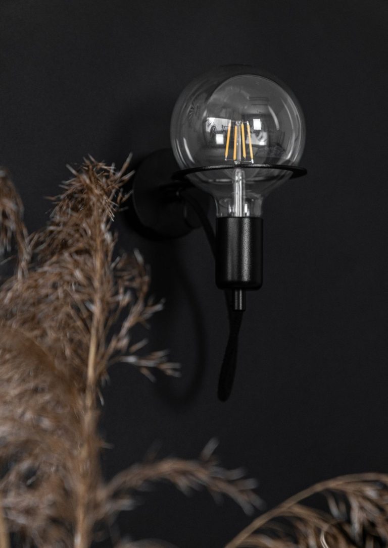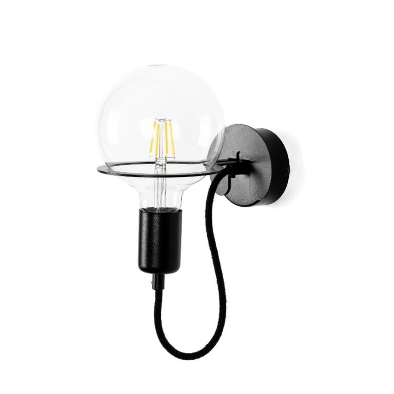 Uwielbiamy tę prostą, prawie ascetyczną, a przy tym niesamowicie efektowną kompozycję. Minimalistyczny kinkiet składa się z metalowego lakierowanego naściennego stelaża z maskownicą, krótkiego przewodu w oplocie oraz okrągłego trzymadełka, które doskonale eksponuje dużą dekoracyjną żarówkę. Średnica całej lampy wynosi 12 cm, jej głębokość równa się 19 cm, a czarny kabel ma 20 cm długości. W zestawie oferujemy również żarówkę – zaraz po odpakowaniu czarny kinkiet nadaje się już do powieszenia na ścianie.