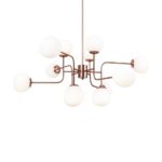 Jedną z wyróżniających się cech, oferowanej lampy nowoczesnej, jest metalowy i niezwykle stylowy stelaż z wygiętymi ramionami – do nich przytwierdzone są szklane klosze o pięknym mlecznym odcieniu. Mosiężna lampa sufitowa Erich 12 w nowoczesnym designie ma wysokość 134 cm oraz szerokość i głębokość 105 cm.