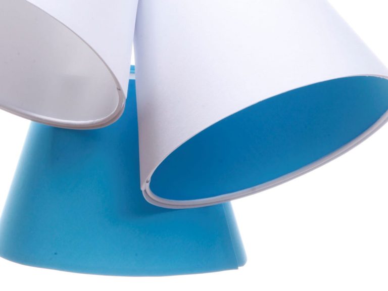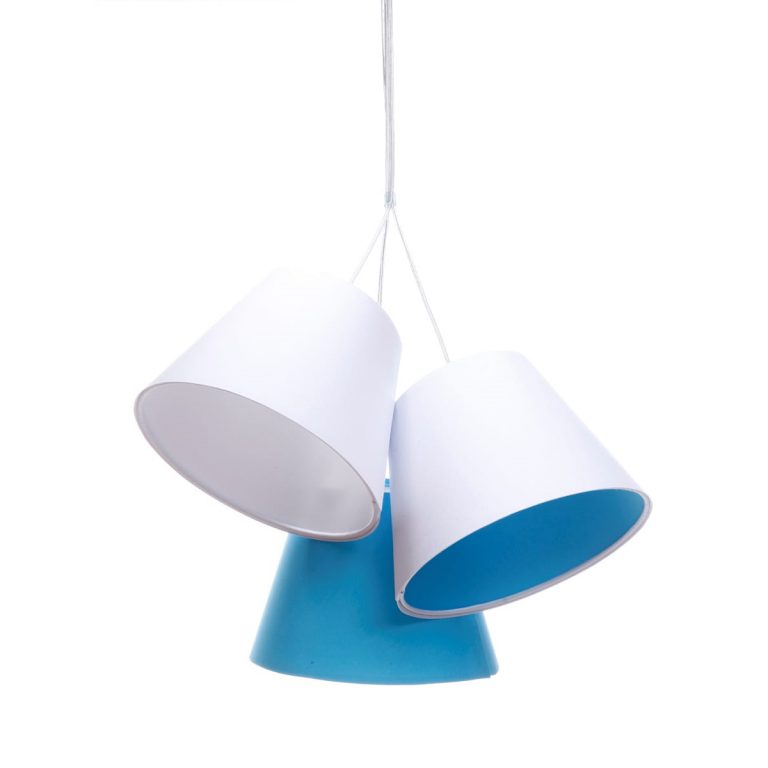 Klosze tej lampy wiszącej występują w dwóch przeplatających się kolorach. Pierwszy abażur jest biały, drugi niebieski, a trzeci biały z niebieskim wnętrzem. Klosze mają klasyczny stożkowy kształt, który pasować będzie do każdej nowoczesnej i klasycznej aranżacji. Dolna średnica każdego z nich wynosi 25 cm, a górna 15 cm.