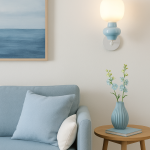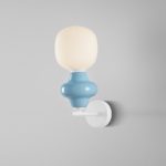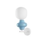 Niebieski kinkiet ścienny Vilrosa do salonu posiada nietuzinkowy klosz, który łączy jasnoniebieską ceramikę z białym szkłem, tworząc elegancką i nowoczesną całość. Klosz w pastelowych odcieniach sprawia, że oferowane oświetlenie wnosi do wnętrza przytulną atmosferę i nadaje aranżacji nieoczywistego charakteru.