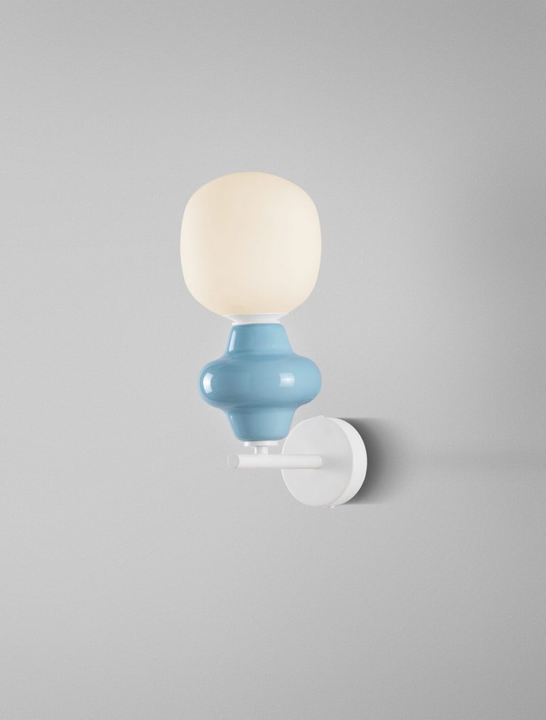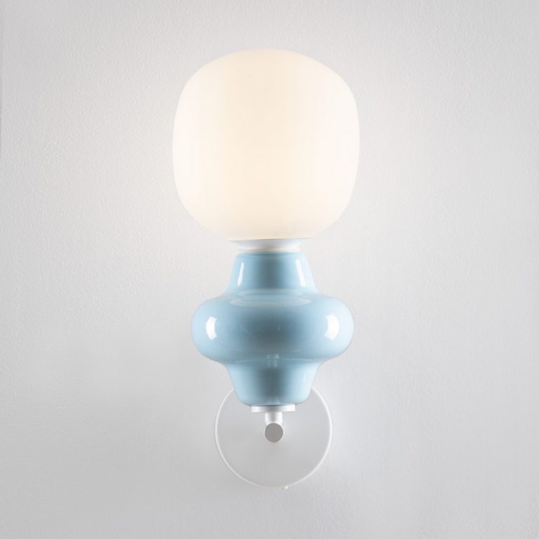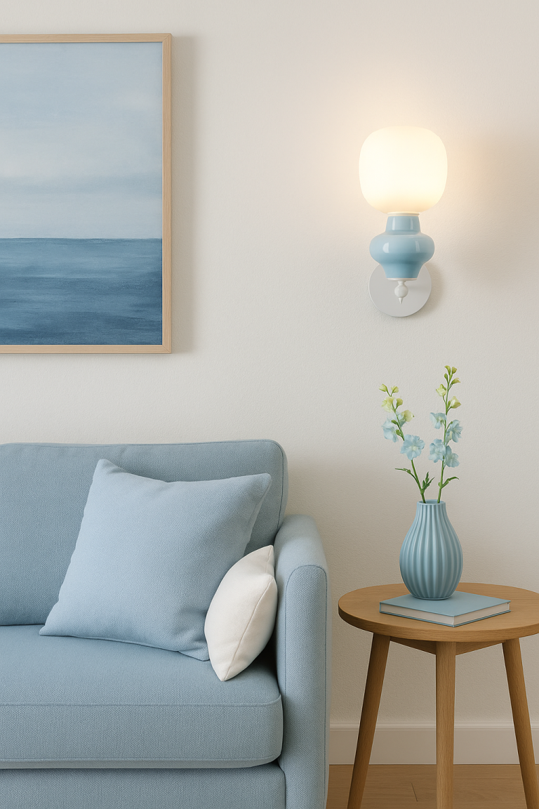 Niebieski kinkiet ścienny Vilrosa do salonu posiada nietuzinkowy klosz, który łączy jasnoniebieską ceramikę z białym szkłem, tworząc elegancką i nowoczesną całość. Klosz w pastelowych odcieniach sprawia, że oferowane oświetlenie wnosi do wnętrza przytulną atmosferę i nadaje aranżacji nieoczywistego charakteru.