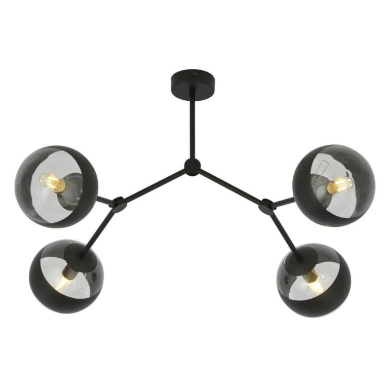 Czas przyjrzeć się oświetleniu na sufit do salonu Helga 4 nieco bliżej. Przede wszystkim, warto zwrócić uwagę na jej niezwykle pomysłową konstrukcję, która przypomina wygląd modelu cząsteczki chemicznej. Podsufitka, ramiona z przegubami oraz źródła światła zamknięte w kulistych kloszach – to wyjątkowo oryginalny projekt – który dodatkowo podkreśla czarna kolorystyka metalowego stelaża oraz transparentność szklanych kul (ozdobionych czarnym paskiem).