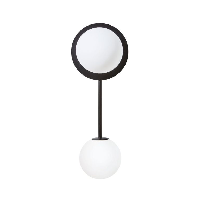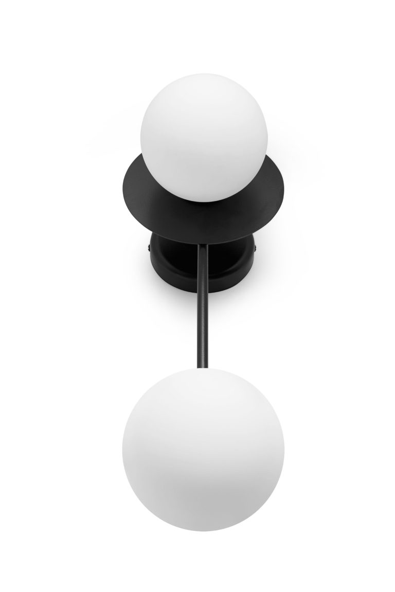 Kinkiet w stylu nowoczesnym FURIKO A wykonany został z trzech głównych elementów – metalowego stelaża oraz dwóch szklanych kloszy. Metal w czarnym kolorze doskonale kontrastuje z białym szkłem, dając niezwykle inspirujący efekt wizualny. Każdy klosz ma ten sam kulisty kształt i średnicę 15 cm. Jeden z nich znajduje się bezpośrednio przy mocowaniu ściennym, a drugi nieco niżej na stelażu – to bez wątpienia nietypowa konstrukcja, która przyciągnie uwagę każdego Twojego gościa.