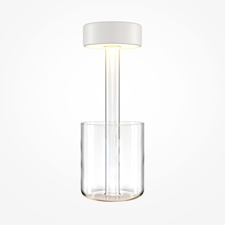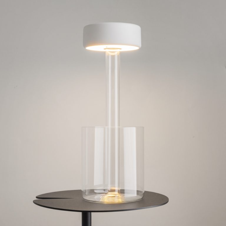 Designerska lampa stołowa Al Collaboration w białym kolorze wyposażona jest w transparentną szklaną podstawę, która pełnić może również funkcję wazonu na kwiaty lub pojemnika na inne dekoracje. Biała lampa Al Collaboration znakomicie prezentuje się postawiona na komodzie, stole, barze i biurku.