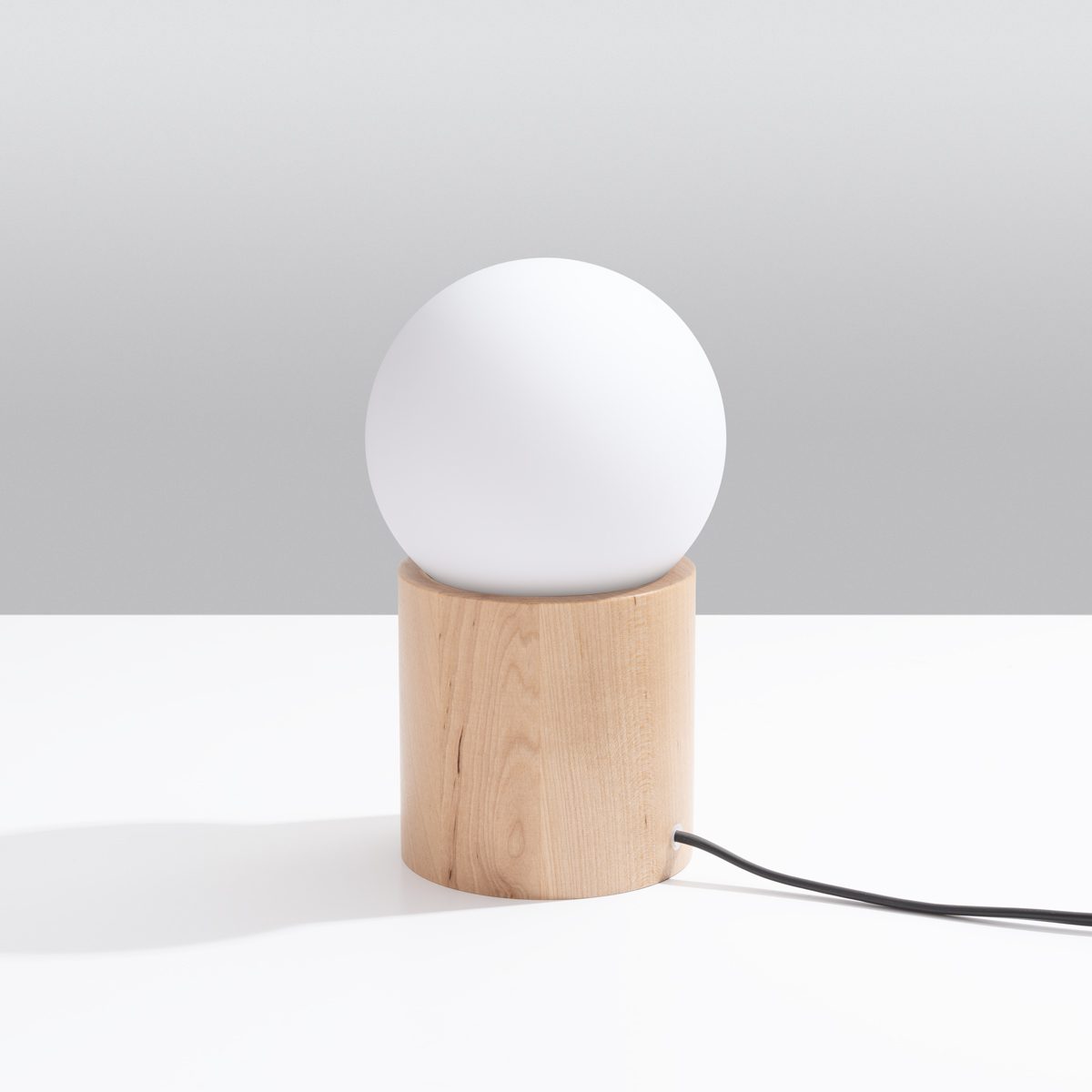 Nowoczesna lampa stołowa Funi na drewnianej nodze ma niewielkie rozmiary, dlatego z łatwością znajdziesz dla niej miejsce nawet na małym biurku, stoliku nocnym, półce, czy parapcie. Prezentowana lampa do biura wyposażona jest w biały szklany klosz w kształcie kuli, który bardzo dobrze rozprasza światło. Klosz doskonale komponuje się z podstawą w naturalnym kolorze. Nowoczesna lampa stołowa na drewnianej nodze znakomicie pasuje do wnętrz nowoczesnych i skandynawskich.