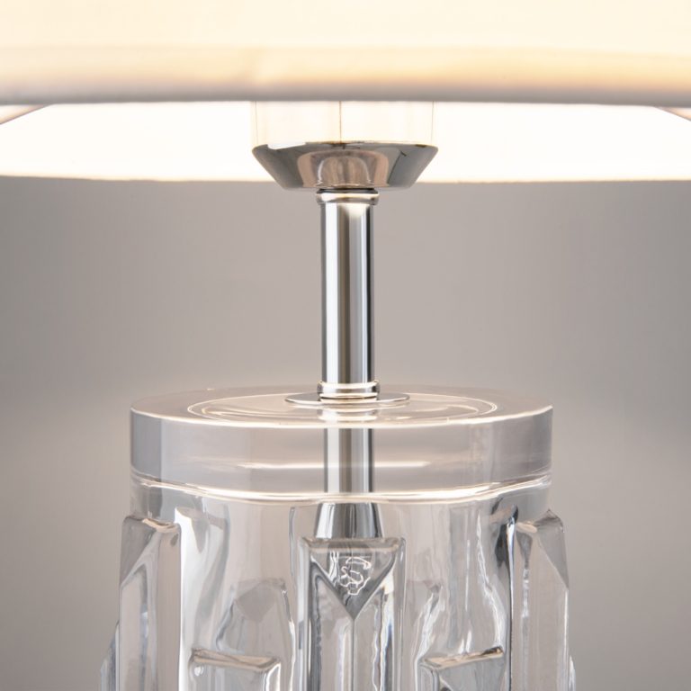 Nowoczesny design w połączeniu z neutralną kolorystyką pozwala na łatwe dopasowanie oferowanej lampy ze szklaną podstawą do różnych aranżacji – w tym inspirowanych stylem glamour i klasycznym.