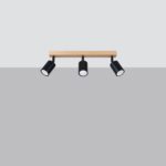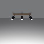 Nowoczesna lampa sufitowa Anderson 3 w czarnym kolorze składa się z podłużnej podsufitki wykonanej z drewna oraz z trzech metalowych kloszy w kształcie tuby. Każdy z nich przystosowany jest energooszczędnych żarówek GU10. Czarna lampa Anderson 3 ma szerokość 61 cm i wysokość 17,5 cm – nadaje się zarówno do zamontowania na suficie podwieszanym, jak i zwykłym.