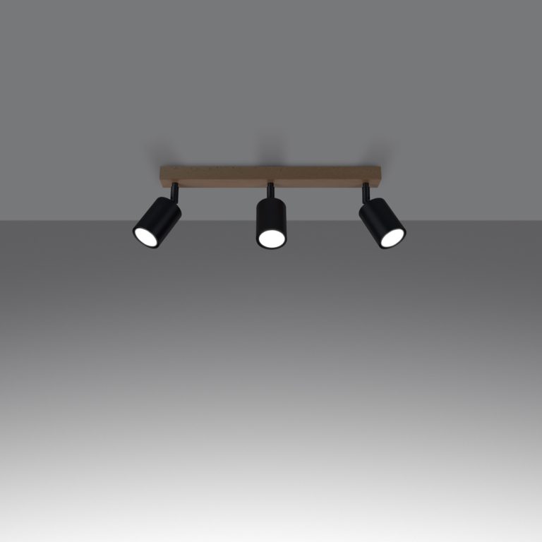 Nowoczesna lampa sufitowa Anderson 3 w czarnym kolorze składa się z podłużnej podsufitki wykonanej z drewna oraz z trzech metalowych kloszy w kształcie tuby. Każdy z nich przystosowany jest energooszczędnych żarówek GU10. Czarna lampa Anderson 3 ma szerokość 61 cm i wysokość 17,5 cm – nadaje się zarówno do zamontowania na suficie podwieszanym, jak i zwykłym.