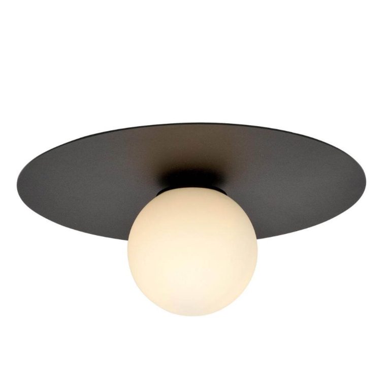 Oferowane oświetlenie na sufit składa się z dwóch głównych elementów: stalowej podsufitki w czarnym kolorze oraz szklanego klosza w białym odcieniu. Stelaż ma okrągły kształt, klosz ma formę kuli – całość idealnie do siebie pasuje. Szklana lampa na sufit do salonu Manx tworzy wyjątkowo elegancki kontrast barw, który doskonale będzie się zestawiać z najróżniejszymi aranżacjami. Równie uniwersalne są jej wymiary: wysokość 19 cm i szerokość 43 cm. Średnica szklanego klosza wynosi 15 cm.