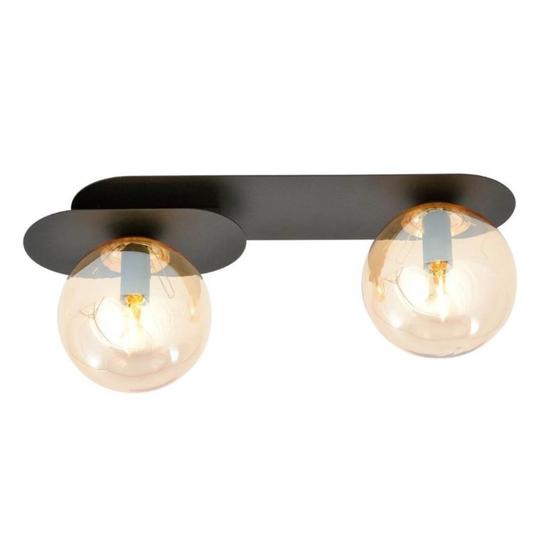 Tym, co od razu przykuwa nasz wzrok do sufitowej lampy Rahim 2, są zdecydowanie dwa oryginalne klosze. Wszystkie mają bardzo modny geometryczny kształt kuli i wykonane zostały ze szkła w przepięknym miodowym odcieniu. Oba klosze mają identyczną średnicą 14 cm i wyposażone są w jedno źródło światła, którym mogą być, między innymi, energooszczędne żarówki typu LED. Kolorowe szkło delikatnie ociepla światło, dzięki czemu całe wnętrze zyskuje na przytulnym klimacie oraz dekoracyjności.