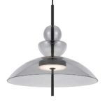 Poza czarną podsufitką z metalu, lampa nowoczesna Bangkok posiada szklany klosz w kształcie misy dodatkowymi elementami ozdobnymi. Model wyposażony jest również w długi przewód, który możesz skrócić tak, aby dopasować oświetlenie do wnętrza. Nowoczesna lampa wisząca Bangkok na czarnej podsufitce to także zintegrowanie oświetlenie LED.