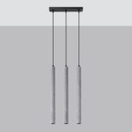Oferowana lampa na listwie posiada betonowe klosze w szarym kolorze, które nadają całości oryginalnego wyglądu. Nowoczesna lampa wisząca Callum 3 na listwie doskonale pasuje do minimalistycznych chłodnych aranżacji, świetnie zestawia się metalem i szkłem.