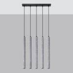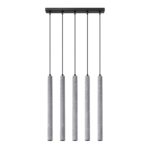 Cała lampa wisząca w nowoczesnym stylu Callum 5 składa się z podłużnej podsufitki oraz pięciu betonowych kloszy, które zawieszone są na długich przewodach. Poszczególne kable możesz regulować, tym samym dostosować wysokość oświetlenia do wnętrza i własnej aranżacyjnej wizji. Nowoczesna lampa wisząca Callum 5 na listwie doskonale sprawdza się w roli lampy nad wyspę kuchenną, ale nie jest to jej jedyne zastosowanie. Ponadto model przeznaczony jest do energooszczędnych żarówek LED, także tych z funkcją kontrolowania poziomu natężenia światła.