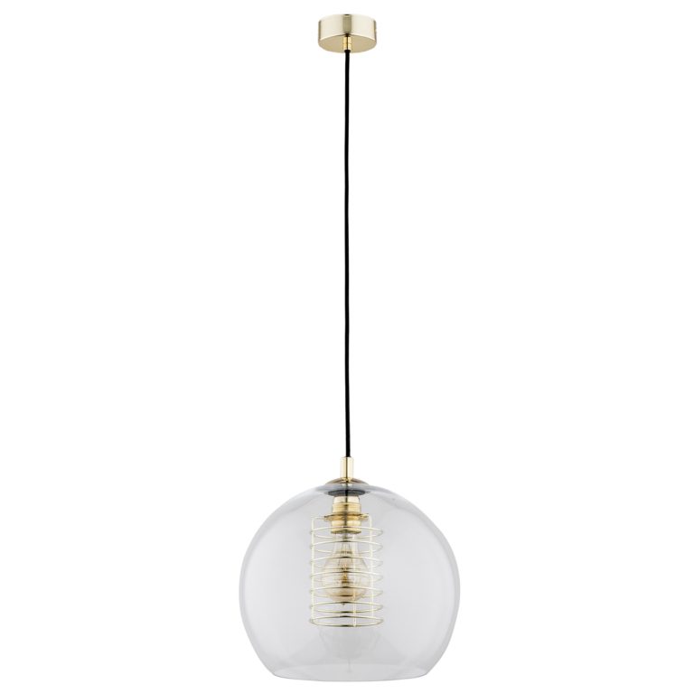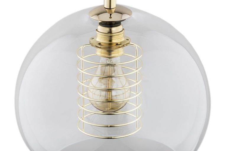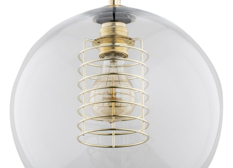 Nowoczesna lampa wisząca Dover A ze złotym elementem rozjaśni zarówno mniejszą, jak i większą przestrzeń. Model wyposażony jest w kulisty klosz o średnicy 30 cm, który wykonany został z transparentnego, doskonale przepuszczającego światło, klosza. Oprócz ażurowej osłony żarówki, lampa wisząca w nowoczesnym stylu Dover A uzupełniona została w przewód zasilający w postaci zawieszenia oraz okrągłą podsufitkę.