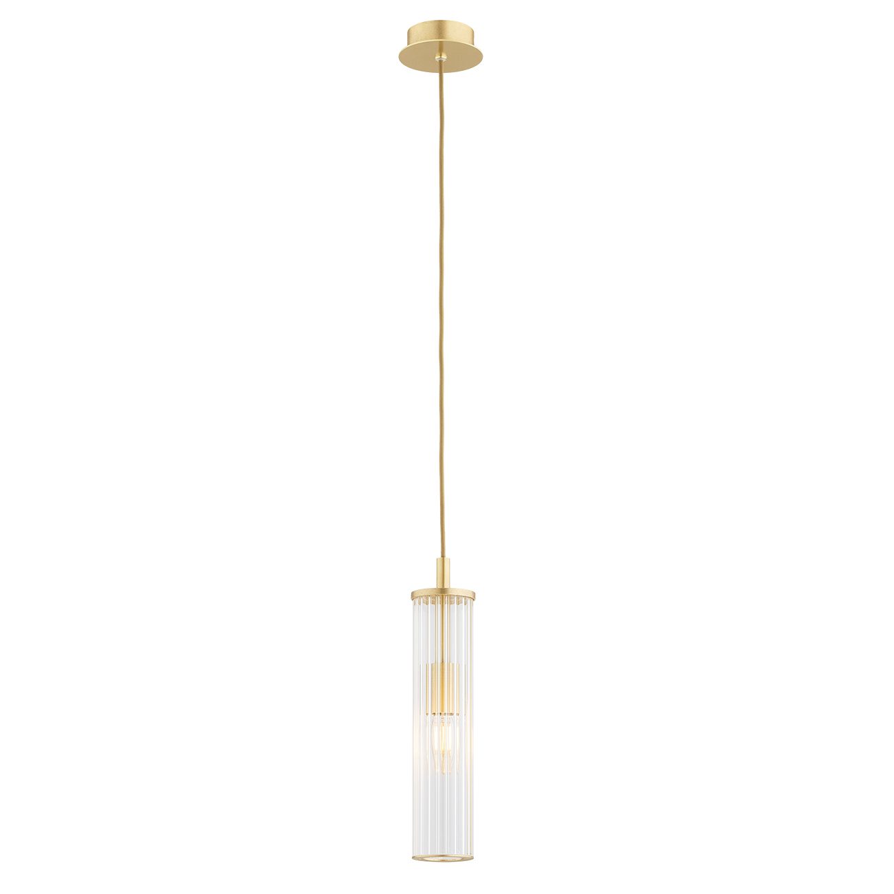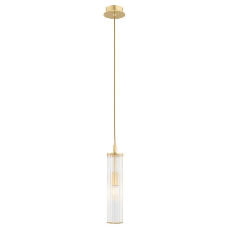 Ujmuje designerskim wyglądem i sprawia, że całe wnętrze nabiera wyjątkowości – nowoczesna lampa wisząca Hampton o prostym designie wyposażona jest w podłużny klosz wykonany z dekoracyjnego transparentnego szkła. Uzupełnieniem dla niego jest mosiężny stelaż w typowym dla tego materiału złotym kolorze.
