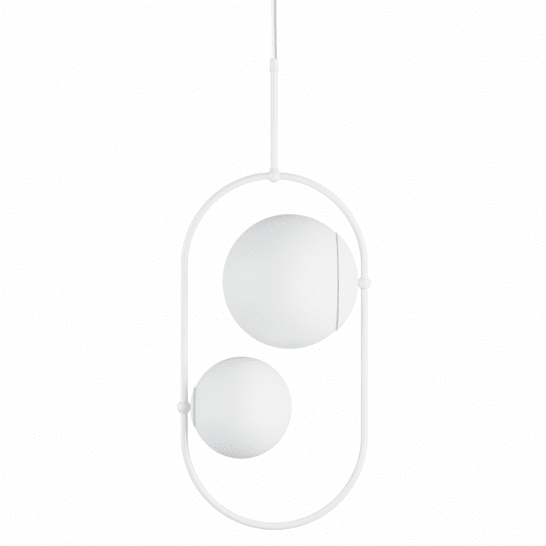 Dostępna w naszym sklepie Ryssa lampa wisząca do salonu Koban C wyposażona została w dwa kuliste klosze o różnej wielkości. Górna kula jest większa i ma średnicę 20 cm, a dolna mniejsza i ma 14 cm. To zróżnicowanie kloszy sprawia, że model ten przykuwa uwagę i prezentuje się oryginalnie. Dodatkowo oba klosze okala biały stelaż, który wykonany został z metalu.