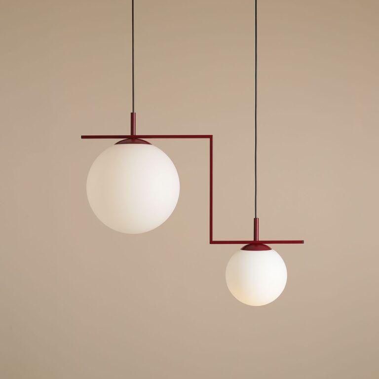 Lampa wisząca nowoczesna Tora charakteryzuje się geometryczną formą, na którą składa się prosta listwa, stelaż o złamanych pod kątem prostym liniach oraz dwa klosze w kształcie idealnej kuli. Każdy z kloszy ma inną średnicę (mniejszy 20 cm, większy 30 cm), co nadaje oprawie jeszcze większej dynamiczności. Przy tym wszystkim, nowoczesna lampa wisząca Tora w bordowym kolorze prezentuje się lekko i doskonale wkomponowuje się we wnętrza. Bordowy stelaż zestawiony został z bielą kloszy, dzięki czemu całość jest wyrazista, ale nie krzykliwa.