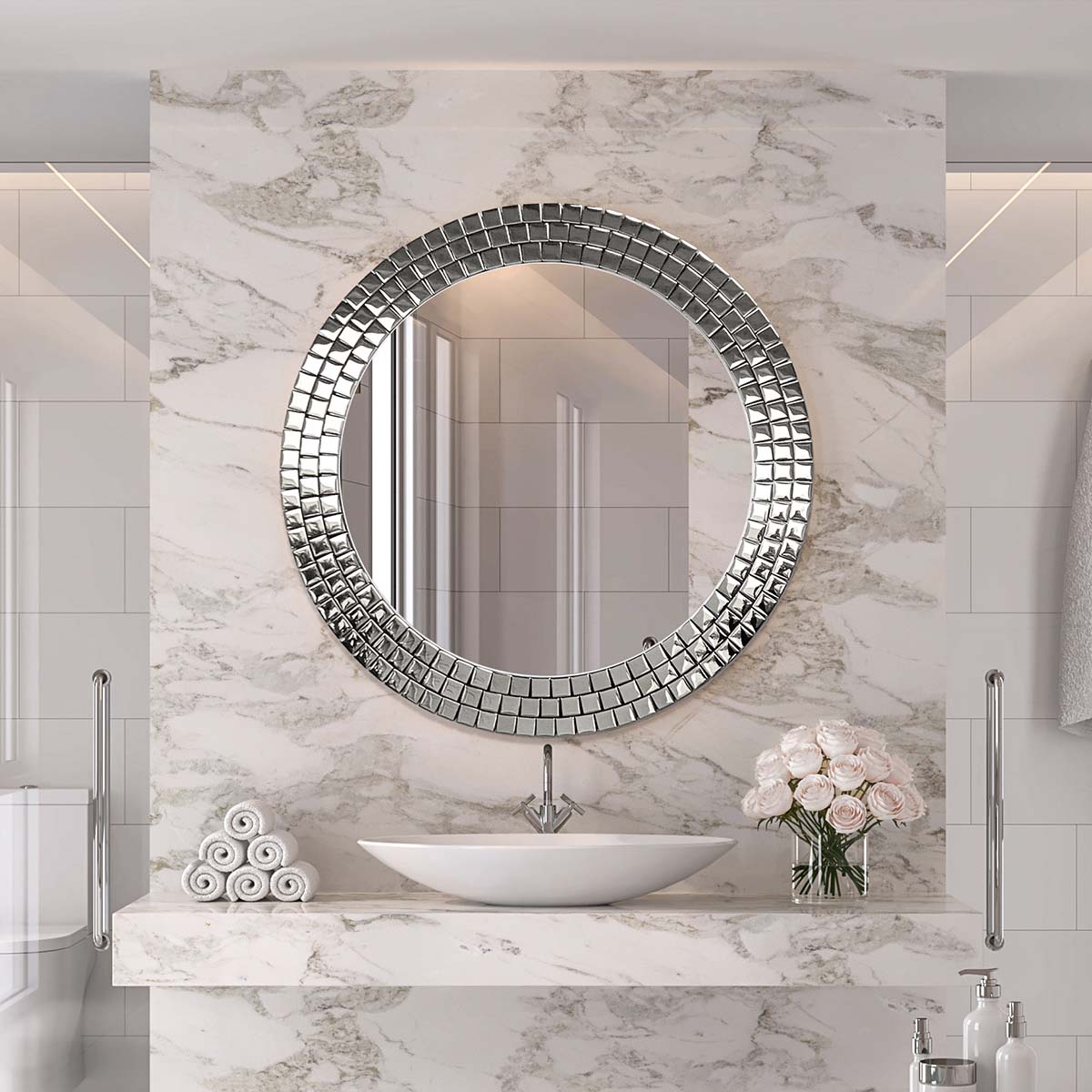 Polecane lustro w okrągłym kształcie to również niezwykle dekoracyjny dodatek – zwierciadło wyposażone jest bowiem w ramę wykonaną ze szklanej mozaiki w srebrnym kolorze. Aby stworzyć aranżację pełną harmonii i blasku, koniecznie dopasuj do lustra Aurora Silver również inne elementy wyposażenia o podobnej stylistyce. Nowoczesne lustro do łazienki Aurora Silver ze srebrną ramą doskonale komponuje się, między innymi, z dodatkami inspirowanymi nurtem glamour.
