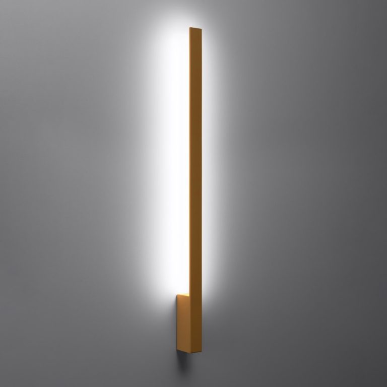 Nowoczesny kinkiet ścienny Lahti L w złotym kolorze wykonany został z wysokiej jakości aluminium, które zapewnia nie tylko trwałość, ale i estetyczny wygląd na lata. Na konstrukcję modelu składają się dwa główne elementy: podłużny klosz w formie listwy oraz mały, prostokątny stelaż do montażu. Całość tworzy spójną, geometryczną kompozycję, idealnie oddającą charakter minimalistycznych wnętrz.