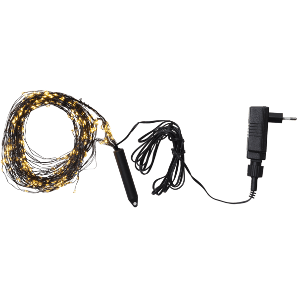 Nowoczesny łańcuch LED z czarnymi drucikami wyposażony jest w kabel zasilający o długości 3 m. Światełka przystosowane są do użytku wewnętrznego.