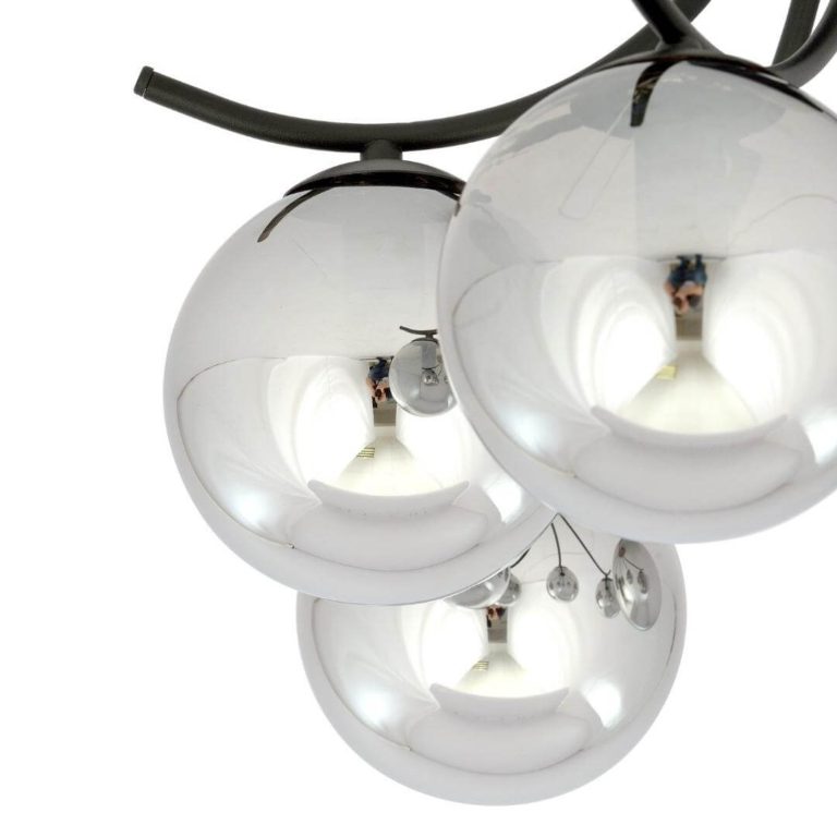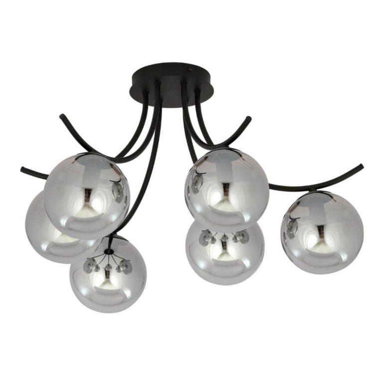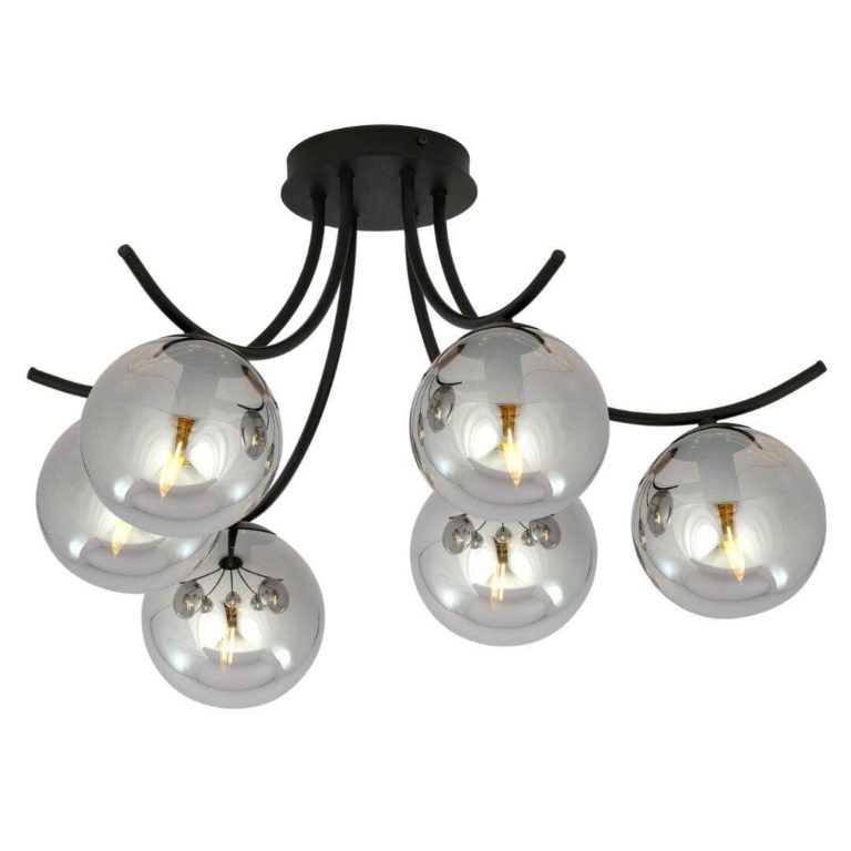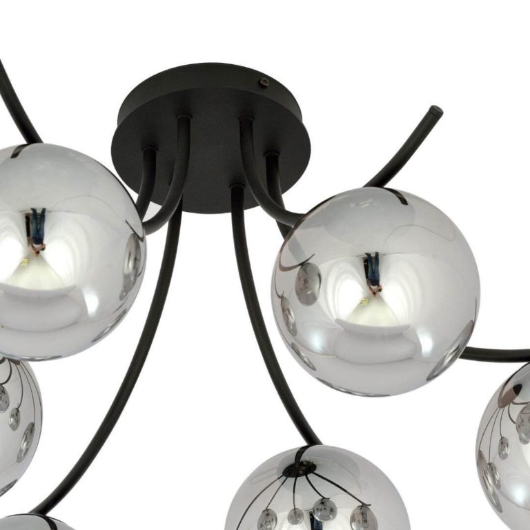 Przedstawiona wyżej lampa sufitowa w nowoczesnym stylu Dali 6 to polski produkt, dlatego wyróżnia go bardzo staranne wykonanie oraz solidność zastosowanych materiałów i komponentów. Model ten składa się z oryginalnego stelaża o wygiętych ramionach (wyraźnie widać tu inspirację słynnymi wąsami hiszpańskiego malarza Salvadora Dali) oraz równie nietypowych i urzekających kloszy. Przyciągają one uwagę nie tylko swoim połyskiem, ale też popielatą kolorystyką. Stelaż wykonany został ze stali lakierowanej na czarno, która tworzy doskonałe tło dla bardzo dekoracyjnych kloszy.