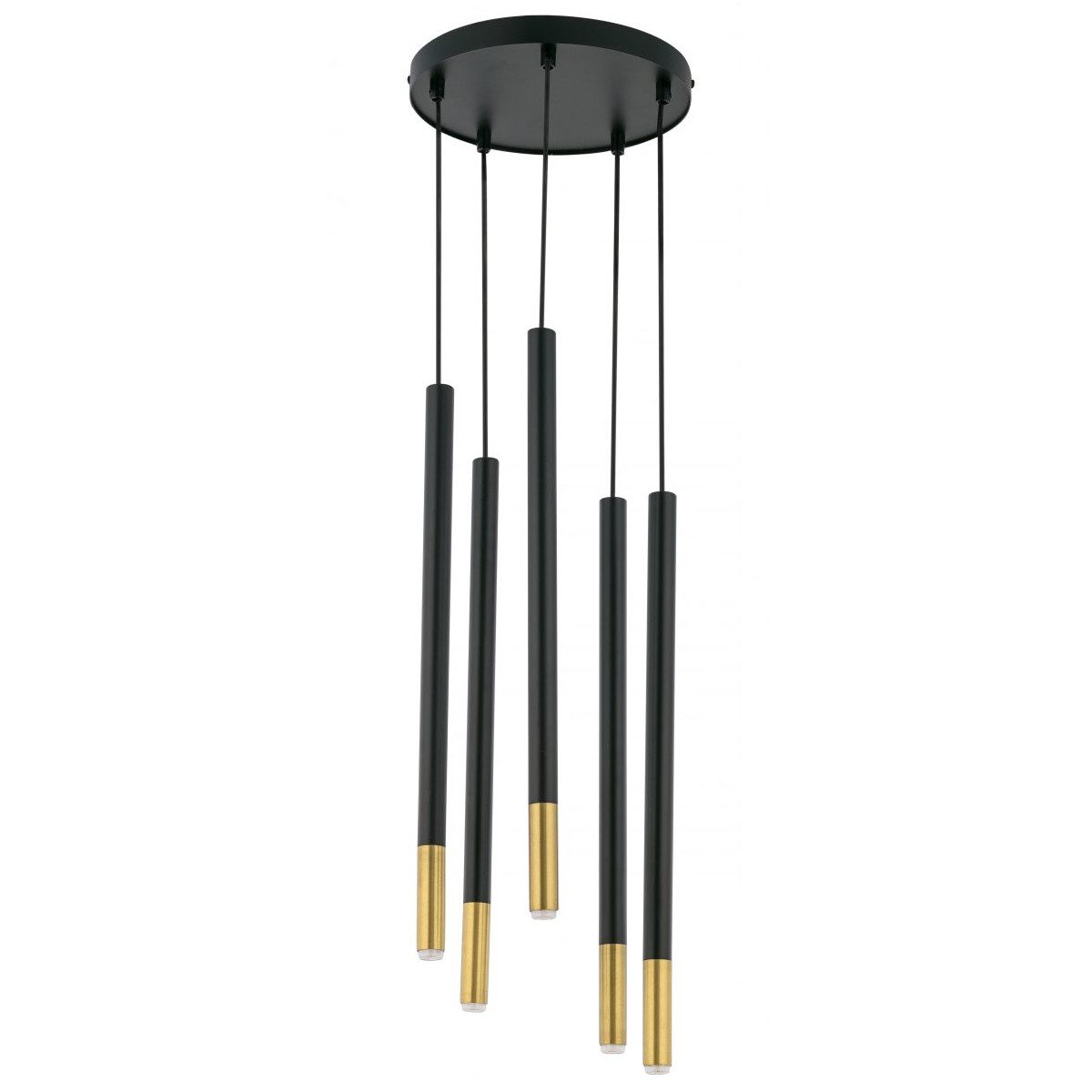 Oferowana przez nasz sklep lampa wisząca składa się z podsufitki, z której zwisa pięć prostych prętów Na ich końcach znajdują się minimalistyczne źródła światła. Model ten wykonany został z metalu w kolorze czarnym, natomiast zakończenie prętów ma przepiękną, złotą barwę. Całość wygląda niezwykle elegancko, przykuwa uwagę, ale jednocześnie nie przytłacza nadmierną dekoracyjnością.