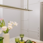 Biała lampa wisząca na listwie Enkel 3 L nad wyspę kuchenną