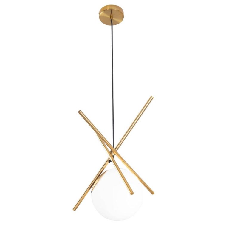 Pojedyncza lampa wisząca nad wyspę kuchenną Xena ma wertykalną formę, wyposażona jest w zawieszenie długie na 140 cm oraz w kulisty klosz w oprawie podłużnych metalowych elementów. To model, który urzeka designerskim wyglądem oraz wyjątkowo eleganckim doborem barw. Wszystkie metalowe elementy mają kolor złota, klosz jest biały. Oryginalna lampa wisząca Xena na mosiężnym stelażu ze sklepu Ryssa ma szerokość 17 cm.