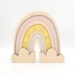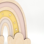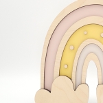 Lampka dekoracyjna Tęcza wyróżnia się nie tylko wyjątkowym wyglądem, ale również wysoką jakością. Model wykonano z naturalnego, certyfikowanego drewna, które pomalowano zostało bezpiecznymi dla dzieci farbami. Model oferuje dwie barwy światła (2700K lub 4000K) oraz dwa sposoby zasilania (sieciowo przez kabel USB lub trzema bateriami AA). Dodatkowo wersja sieciowa oferuje sześciostopniowy ściemniacz światła.
